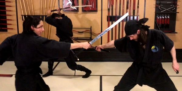 Kenjutsu students practice and perform a long sword drawing form against single and multiple opponents.