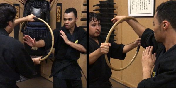 Students are taught to apply rising and dropping parries by executing them against the inner circumference of a rattan ring.
